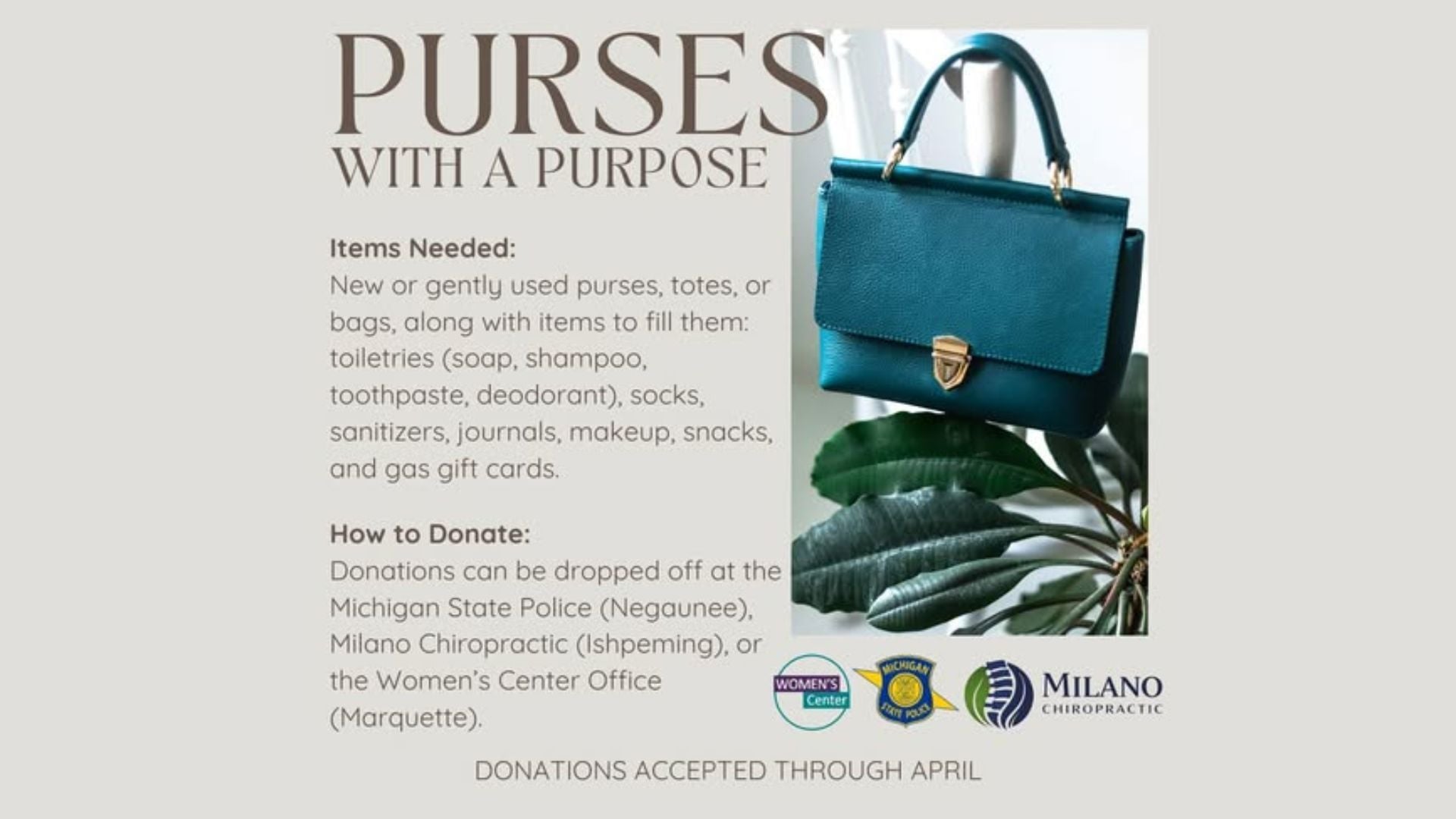 MARQUETTE COUNTY, Mich. (WBUP/WJMN) - Purses with a Purpose is back this April, collecting new or gently used purses, totes, and bags filled with essential items to support people leaving domestic vio...